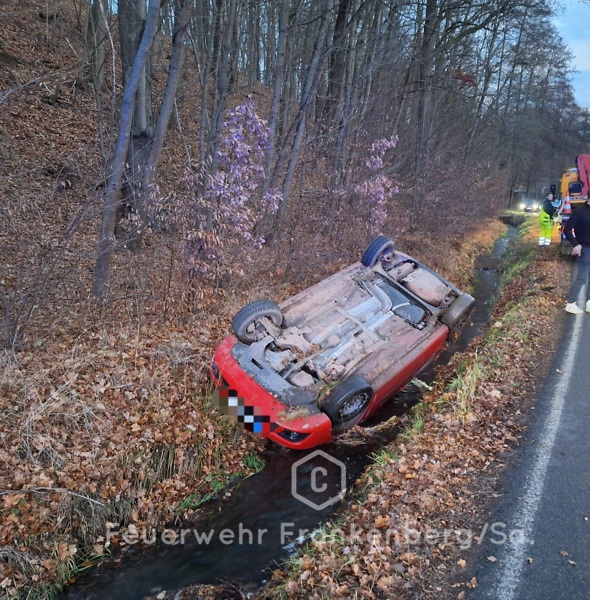 Um 16:05 Uhr wurden wir auf die Frankenberger Straße nach Mühlbach alarmiert. Hier war ein PKW ins Schleudern gekommen und auf dem Dach liegend im Bach gelandet.