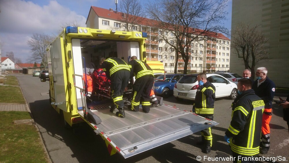 Wir trugen den Patienten mittels Tragetuch aus der 4. Etage zum Schwerlastrettungswagen, da er ins Krankenhaus eingeliefert werden musste.