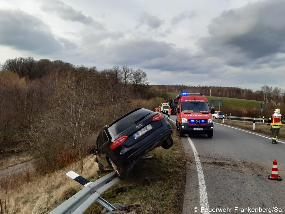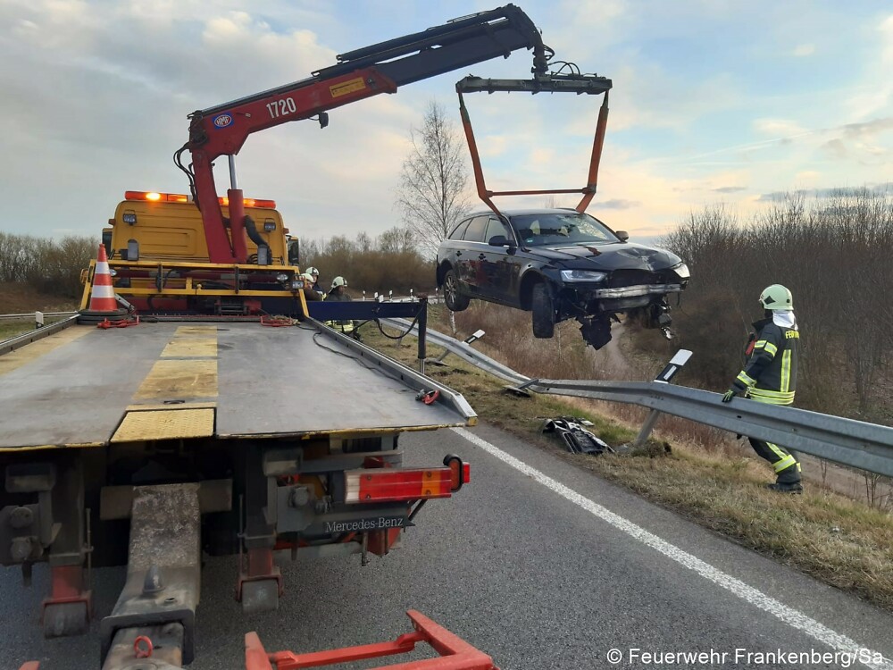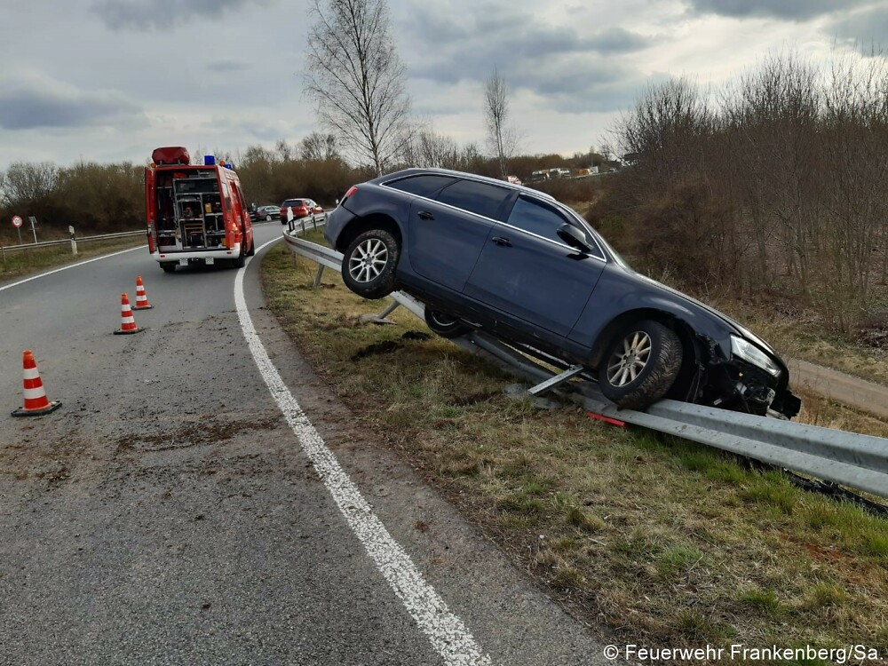 Vor Ort angekommen bestätigte sich die Lage. Der PKW war von der Fahrbahn abgekommen und ist auf der Leitplanke zum Stehen gekommen. Der Fahrer wurde bereits im Rettungswagen behandelt. Wir sicherten den PKW mit einem Spanngurt, da dieser drohte die Böschung hinabzustürzen und banden auslaufende Betriebsmittel.