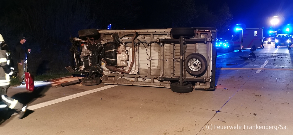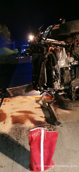 Vor Ort stellte sich heraus, dass ein Transporter mit einem Wildschwein kollidiert war und dieser dann auf der Seite liegen blieb. Beide Insassen waren glücklicherweise nicht mehr eingeklemmt und wurden bereits durch den Rettungsdienst versorgt. Wir sicherten und beleuchteten die Unfallstelle und banden ausgelaufene Betriebsmittel mit Ölbindemittel ab.