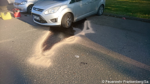 Dort war ein Faß mit Bitumengrund umgeworfen worden und die Flüssigkeit lief über den Parkplatz und in den Abwasserschacht. Wir banden alles mit Bindemittel ab, öffneten den Gulli und kontrollierten diesen. Die Grundierfarbe war bereits bis nach unten vorgedrungen und teilweise schon getrocknet. So konnten wir an dieser Stelle nichts mehr tun.