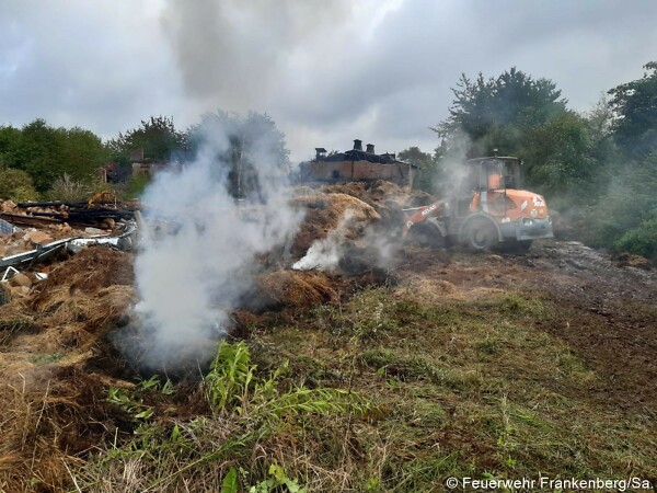 Um 11:35 Uhr begaben wir uns mit dem Tanklöschfahrzeug an die Brandruine. In den Strohresten hatten sich weitere kleine Glutnester gezeigt. Nach einer halbstündigen Unterbrechung durch Einsatz Nr. 134 konnten wir mithilfe eines Radladers des städtischen Bauhofes die betreffenden Stellen ablöschen.