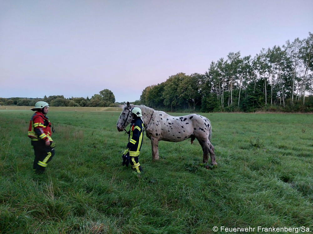 Bei Ankunft an der Einsatzstelle war das Pferd aber bereits aus dem Bachlauf heraus gekommen. Ein zweites Pferd stand ängstlich und aufgeregt noch auf der anderen Seite des Baches. Wir beruhigten beide Pferde und führten sie von der Einsatzstelle weg. Dazu musste die Frankenberger Straße kurzzeitig voll gesperrt werden.