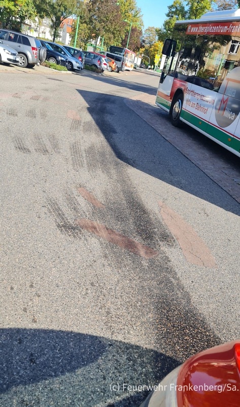 Bereits auf Anfahrt stellten wir eine weitere Straßenverunreinigung im Bereich Altenhainer Straße/Hohe Straße fest. Nach weiterer Kontrolle entdeckten wir mehrere Dieselspuren in Kreuzungsbereichen im gesamten Stadtgebiet. Wir verständigten die Polizei und die Ölwehr. Im weiteren Verlauf konnte die Polizei einen Linienbus feststellen, welcher den Diesel verloren hatte.