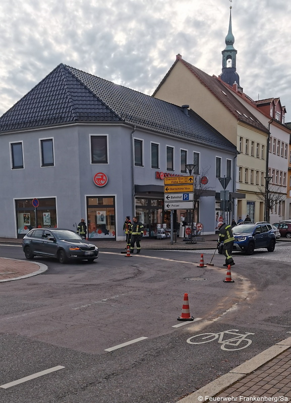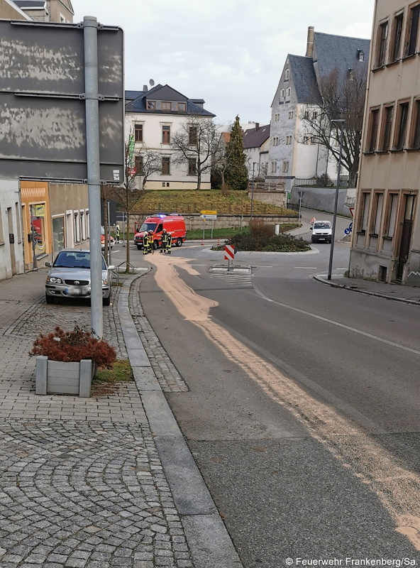 Beim Eintreffen am Einsatzort bestätigte sich die Meldung. Es handelte sich um eine Dieselspur. Wir banden mittels Ölbinder erste Gefahrenquellen ab. Wie sich nach Rücksprache mit Becker Umweltdienst inzwischen herausstellte, zog sich die Dieselspur von Mittweida bis Frankenberg, verursacht durch einen Bus.