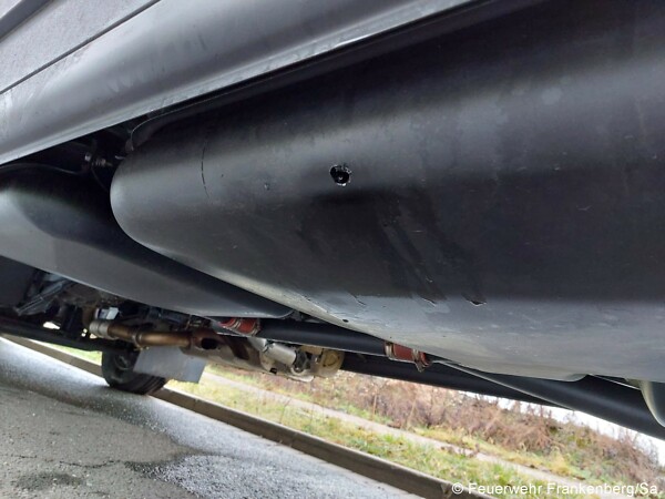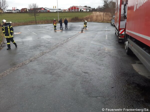 Bei Ankunft konnte allerdings nichts gefunden werden. Nach Rücksprache mit der Leitstelle stellte sich heraus, dass es sich um den Dittersbacher Gewerbering handelte. Also fuhren wir dort hin und stellten eine größere Verunreinigung der Fahrbahn fest. Hier wurde in der Nacht der Dieseltank eines LKW angebohrt und es lief eine unbekannte Menge Diesel auf die Straße und in die Einläufe.