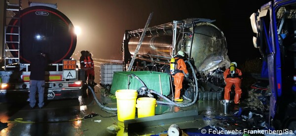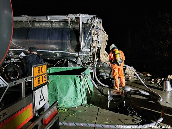 Um 13:39 Uhr wurde der Gefahrgutzug Nord des Landkreises Mittelsachen zusammen mit der Feuerwehr Döbeln auf die BAB 14 in Fahrtrichtung Leipzig alarmiert. Hier kam es zu einem Auffahrunfall von 3 Lastzügen, wobei der mittlere LKW ein Gefahrgut-LKW war aus dem durch den Aufprall beschädigten Tank Natriumaluminatlösung ausgetreten ist.