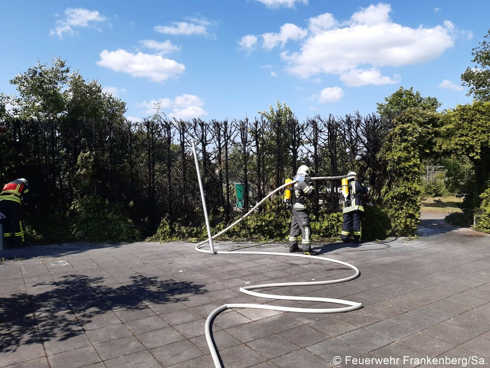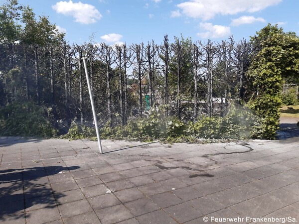 Die Mitarbeiter unternahmen erste Löschversuche mit sämtlichen Feuerlöschern des Heimes. Wir führten Restlöscharbeiten mit einem C-Rohr durch und bewässerten den umliegenden Bereich. Außerdem kontrollierten wir mit der Wärmebildkamera ob sich noch Glutnester in der Hecke befanden.
