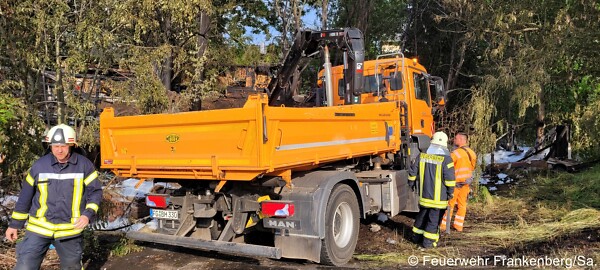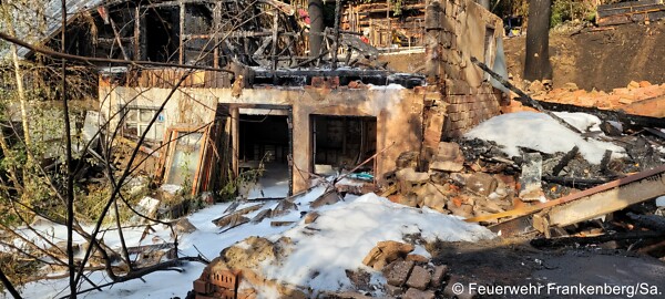 Wir zogen das Brandgut mit einer Mistgabel auseinander und löschten die restlichen Glutnester ab. Nach einer kurzen Wartezeit wurde dann entschieden, die noch stehenden Mauerteile und den Brandschutt mit Hilfe eines Fahrzeuges vom städtischen Bauhof abreißen zu lassen. So konnten auch noch restliche Brandherde gefunden und abgelöscht werden.