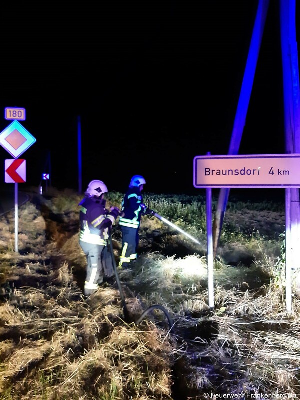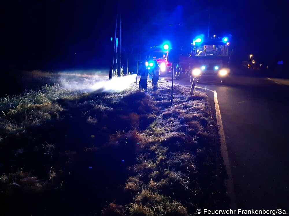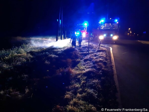 Die nächste Alarmierung ereichte uns um 0:37 Uhr von der Leitstelle Chemnitz. Für uns ging es nach Altenhain, Abzweig Richtung Braunsdorf. Dort wurde durch einen im Einsatz befindlichen Rettungswagen ein Brand am Randstreifen festgestellt.