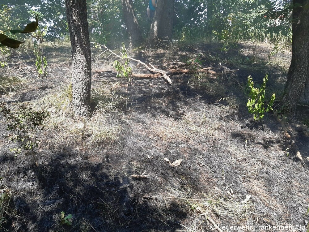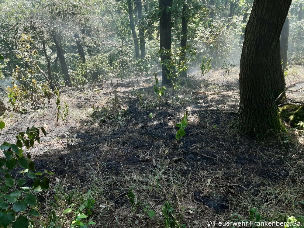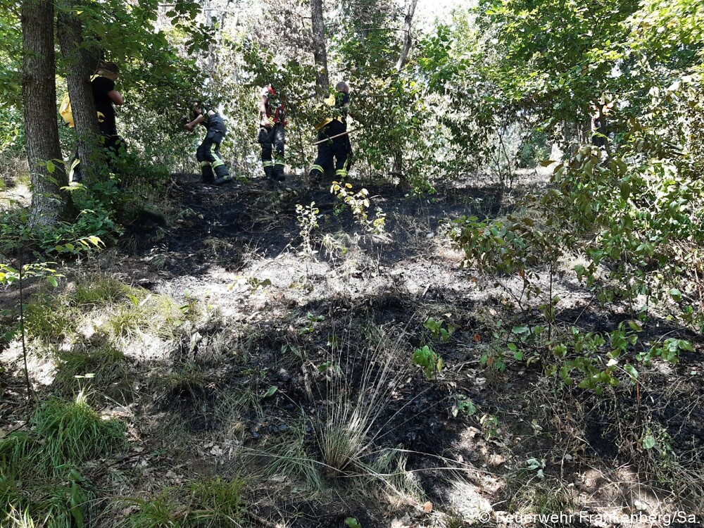 Als wir den genannten Ort anfuhren, ergab die erste Lagerkundung nichts. Allerdings sahen auch wir die Rauchentwicklung und begaben und anschließend mit 3 Fahrzeugen auf die Suche. Nach einer langen und ausgedehnten Erkundung und mit Hilfe einer Drohne eines Kameraden gelang es uns schließlich, den Einsatzort zu finden. Er befand sich hinter dem ehemaligen ELA-Container Gelände in einem Wald. Das Erreichen des Feuers gestaltete sich sehr schwierig, da wir erst zu Fuß und dann noch mit dem Tanklöschfahrzeug über ein noch nicht abgeerntetes Feld mussten.