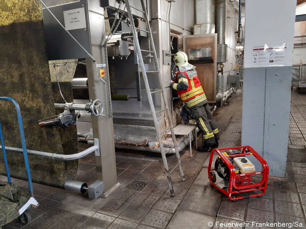 Vor Ort angekommen begannen wir mit der Lageerkundung. Im Bereich, wo der Melder ausgelöst hatte, konnten wir noch eine leichte Verrauchung feststellen. Wir belüfteten den Bereich mittels Lüfter und kontrollierten mit der Wärmebildkamera die Umgebung. Der heiße Wasserdampf war aus einer Verdämpfermaschine ausgetreten und löste so den Melder aus.