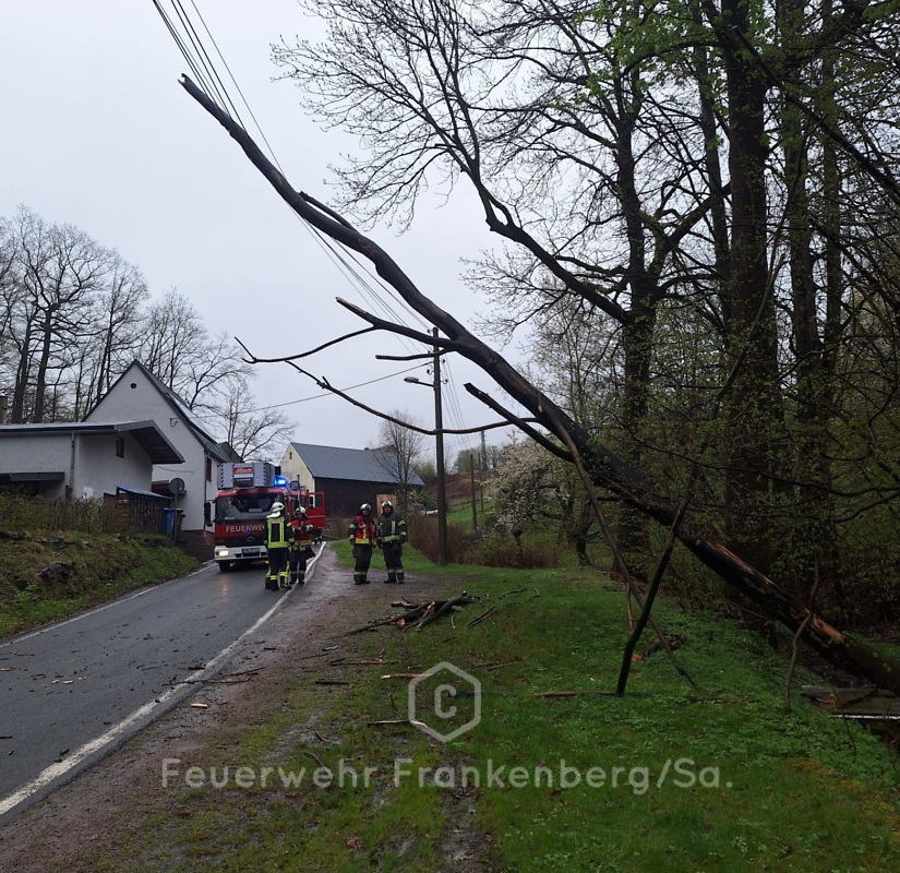 Der Baum war ungünstigerweise in eine Stromleitung gefallen. Wir entfernten den Baum mittels Kettensäge und reinigten grob die Straße.