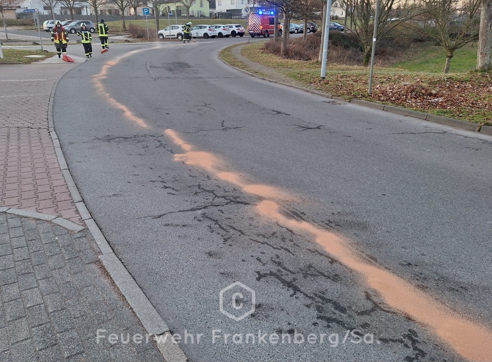 Wir sicherten die Einsatzstelle und banden im Anschluss den ausgelaufenen Kraftstoff. Nachdem wir das Bindemittel wieder aufgenommen hatten konnten wir zurück ins Gerätehaus fahren.