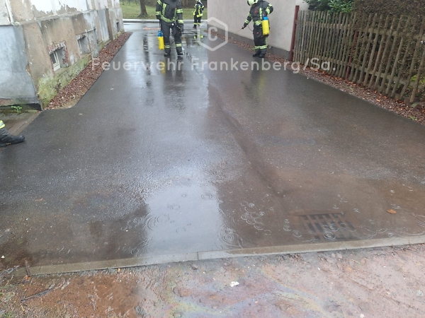 Vor Ort fanden wir eine Fläche von ca. 80m² vor, welche von Öl überzogen war. Dieses lief aus einem Fahrzeug aus, das im Hinterhof geparkt war. Wir banden alles mittels flüssigem Ölbindemittel und verhinderten den weiteren Eintritt in die Kanalisation.